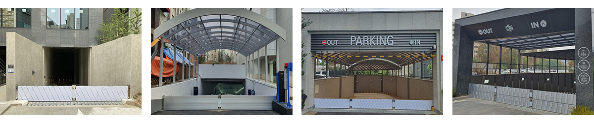지주식 주차장 차수판은 시중에 가장 많이 보급된 차수판으로 좌, 우 지지대(지주)에 차수판을 아래로 밀어 끼워 넣는 방식으로 집중호우 시에만 끼워두고 평상시는 제거하여 보관이 가능.