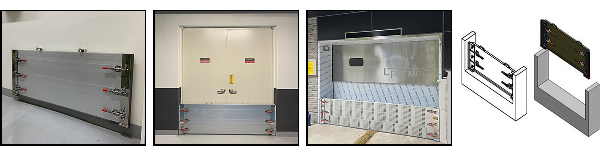 무지주식 차수판은 좌, 우 벽면 지지대(지주)가 필요 없이 차수판 자체에 달려있 는 양쪽 압축 틀만으로 고정을 하여 사용하는 제품으로 좌우 4개의 클램프로(약 1톤)의 힘으로 고정 되며 분체도장을 하여 알루미늄의 산화(녹)를 방지하고, 미관상 수려함이 돋보임.