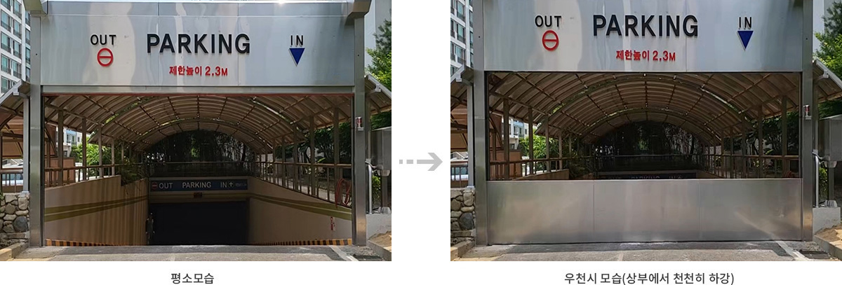 작동방식 평소 차수문은 출입구 벽면에 고정하며 끝까지 이동한 차수문은 강력히 체결된 후 우수유입을 방지.
